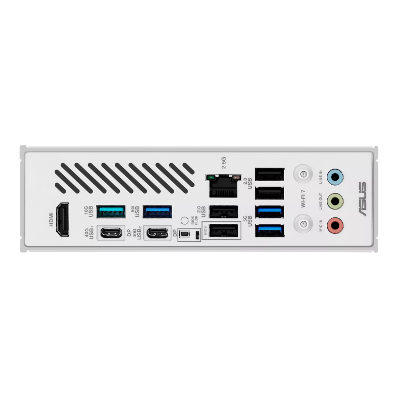 2 x USB4® (40Gbps) ports (2 x USB Type-C®);1 x USB 10Gbps port (1 x Type-A);3 x USB 5Gbps ports (3 x Type-A);4 x USB 2.0 ports (4 x Type-A);1 x HDMI™ port;1 x Wi-Fi module;1 x Realtek 2.5Gb Ethernet port;3 x Audio jacks;1 x BIOS FlashBack™ button |